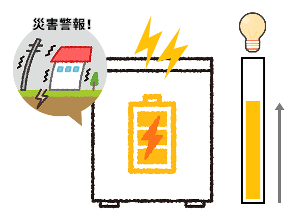 いくら蓄電池があっても、停電時に電気が貯まっていないと意味がありません。エルクホームズの蓄電池は、災害や警報が出たら、自動制御で停電に備え、蓄電池の充電を始めます!