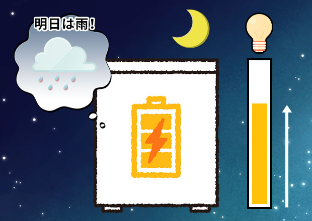 天気予報と連携して自動的に充放電をコントロール!たとえば日中の発電が期待できないときは前日夜間に蓄電池を充電しておくことで、昼間の割高な電力の購入を抑えることができます。
