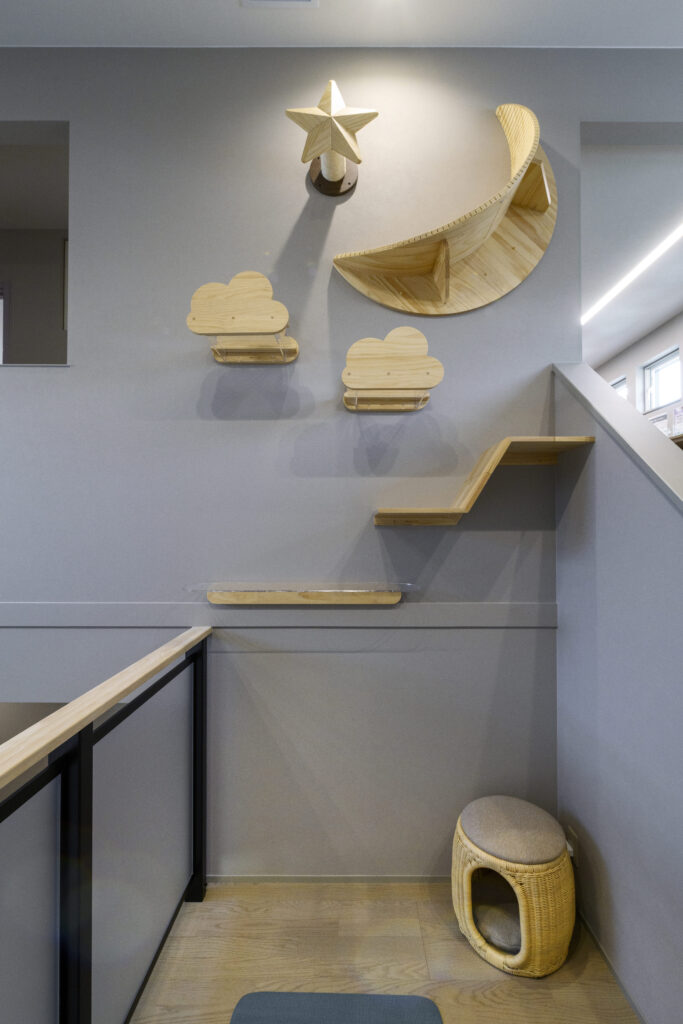 さらに中二階には壁面にキャットウォークを設け、猫がのびのびと動ける空間にしています。ペットと暮らすご家族が増えている背景を踏まえて、これからの住まいづくりには「ペットも家族の一員」として、ペットと暮らす住まいの工夫をご提案しています。