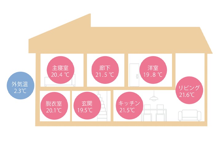 一般的な住宅では、リビングは快適でも廊下や洗面室、トイレが寒い・暑いといった温度差が生じがちです。