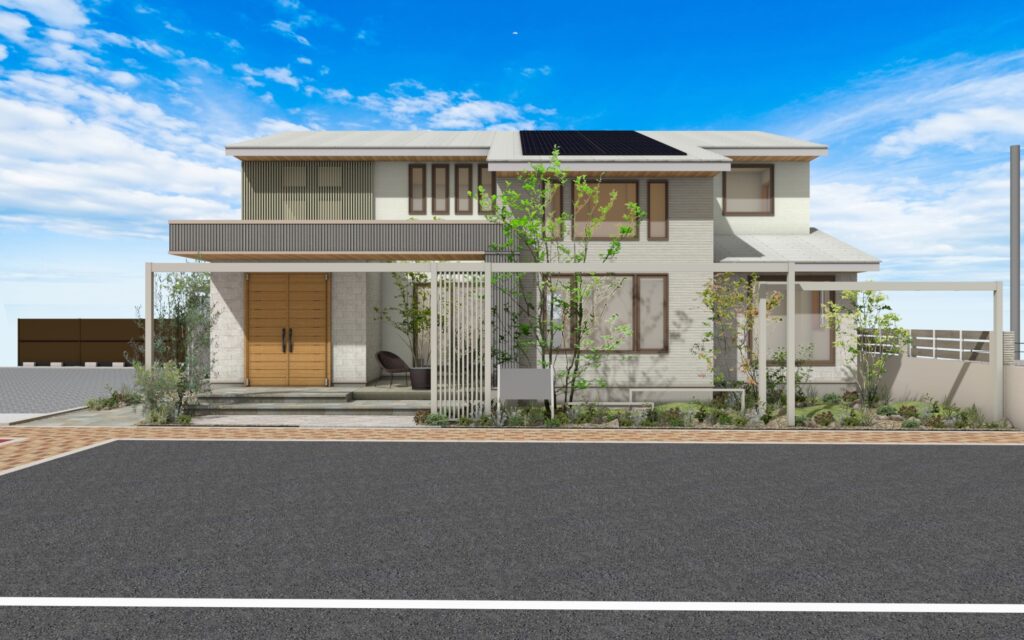 軒の深い屋根に上品な配色が魅力の外観
