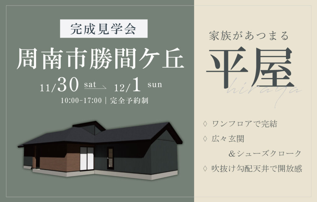 11/30~12/1 周南市勝間ケ丘にて【予約制】平屋完成見学会開催!