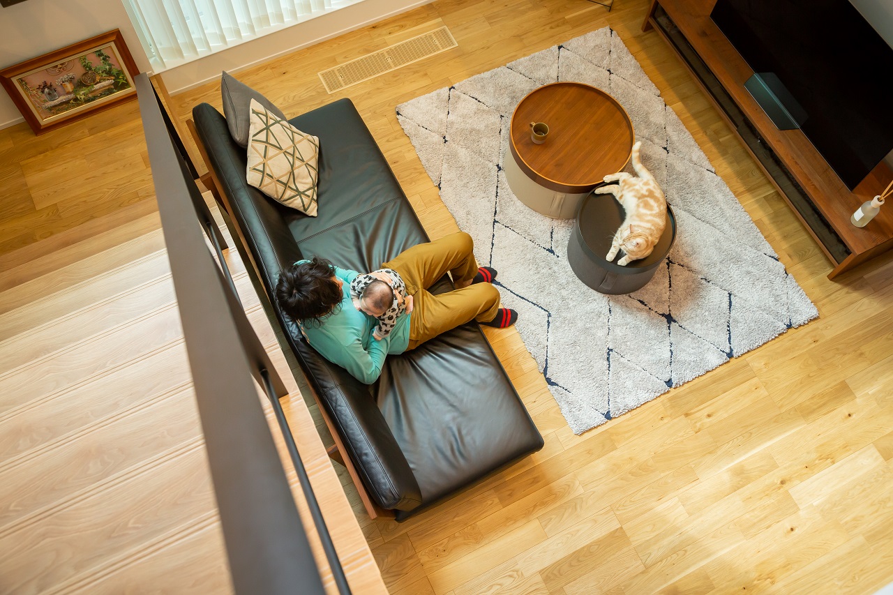 愛猫も家族もリラックスして生活できるような住まいをと、吹き抜けにしたリビングは開放感があり、ソファに座っているだけでくつろげます。