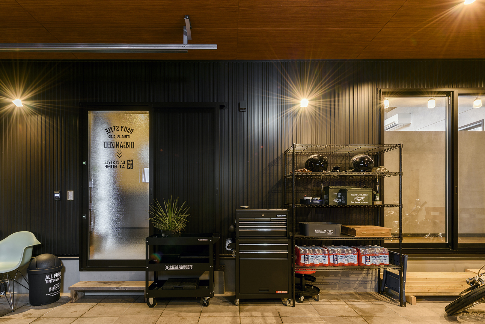 ご夫婦共通の趣味であるバイクが2台と、ご主人の車が入るガレージ。