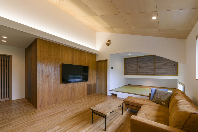 柔らかな木目が印象的なLDKには勾配天井を採用し、平屋ながらも広々とした開放感のある空間になっています。