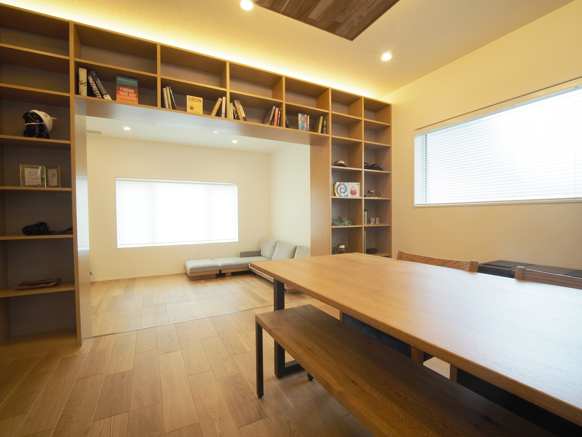 リビングへ目を向けると存在感を放つ大きな書棚。