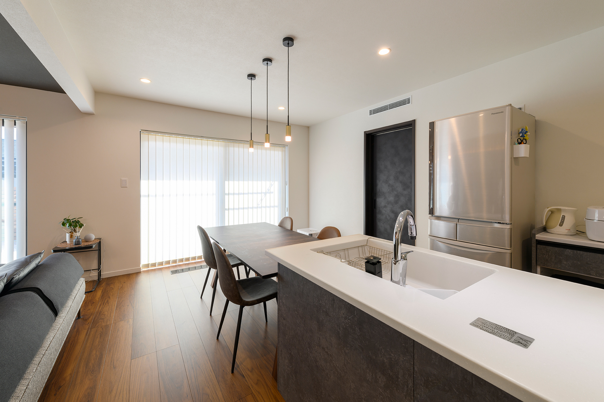 また、来客時はリビングドアと合わせた黒のロールスクリーンで目隠しができます。