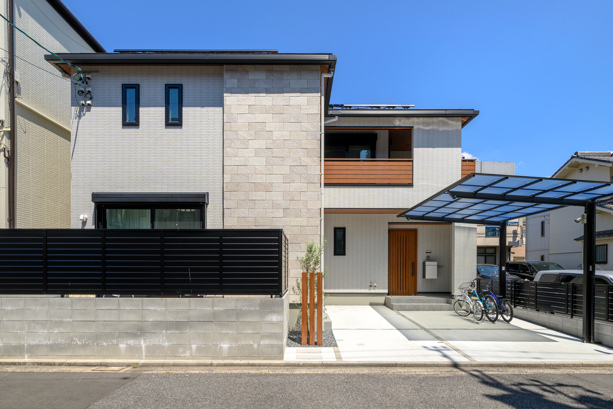 二世帯住宅、外壁のタイル、カーポートや板張りの天井、書斎を作ったり、広いベランダを作ったりと要望も多かったのですが、エルクホームズさんは予算内で自分達の要望を叶えてくれました。