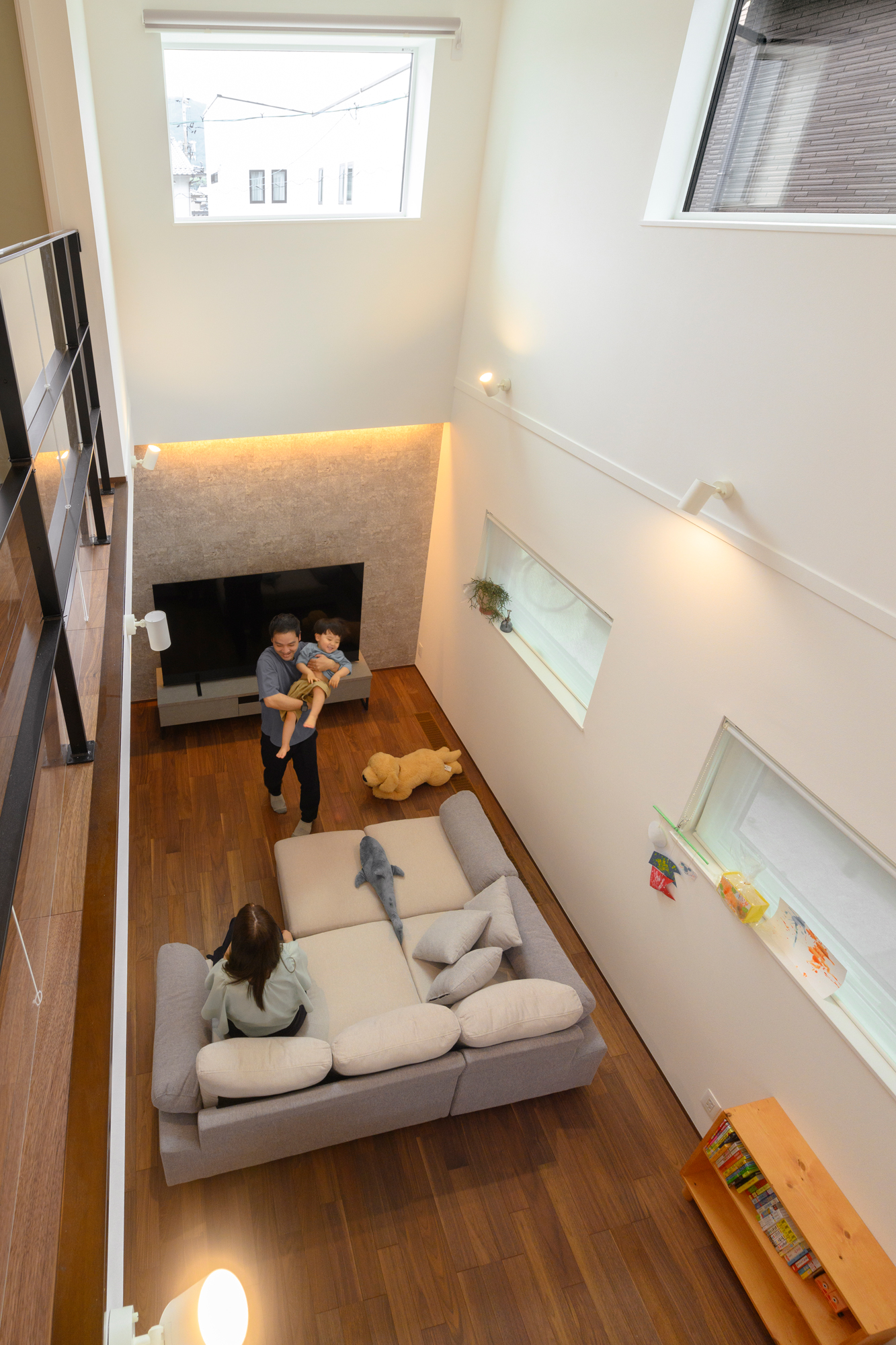 吹き抜けには2方面に窓を設けたことで、日中は照明が無くても明るいほど。
