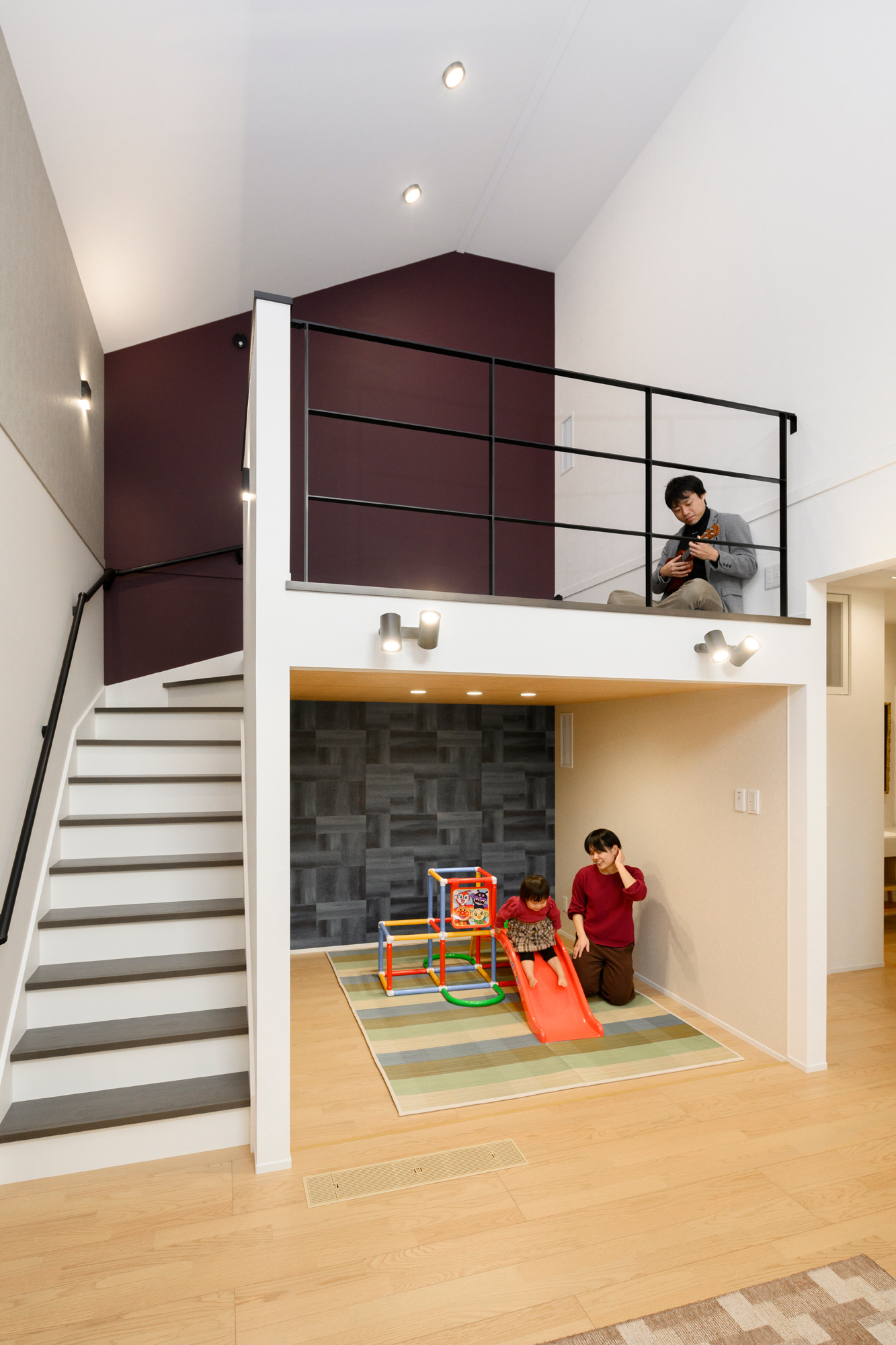 明るく開放的な吹き抜けはリビングだけでなく階段や2階ホールにもつながっており、家のどこにいても家族の気配が感じられる間取りとなっています。