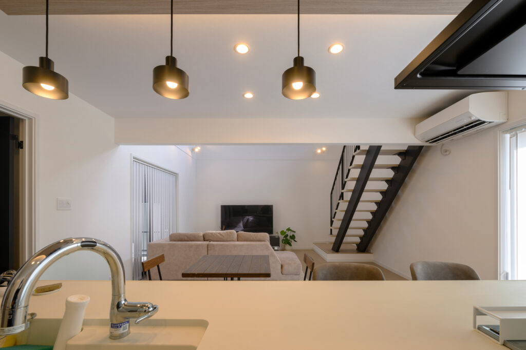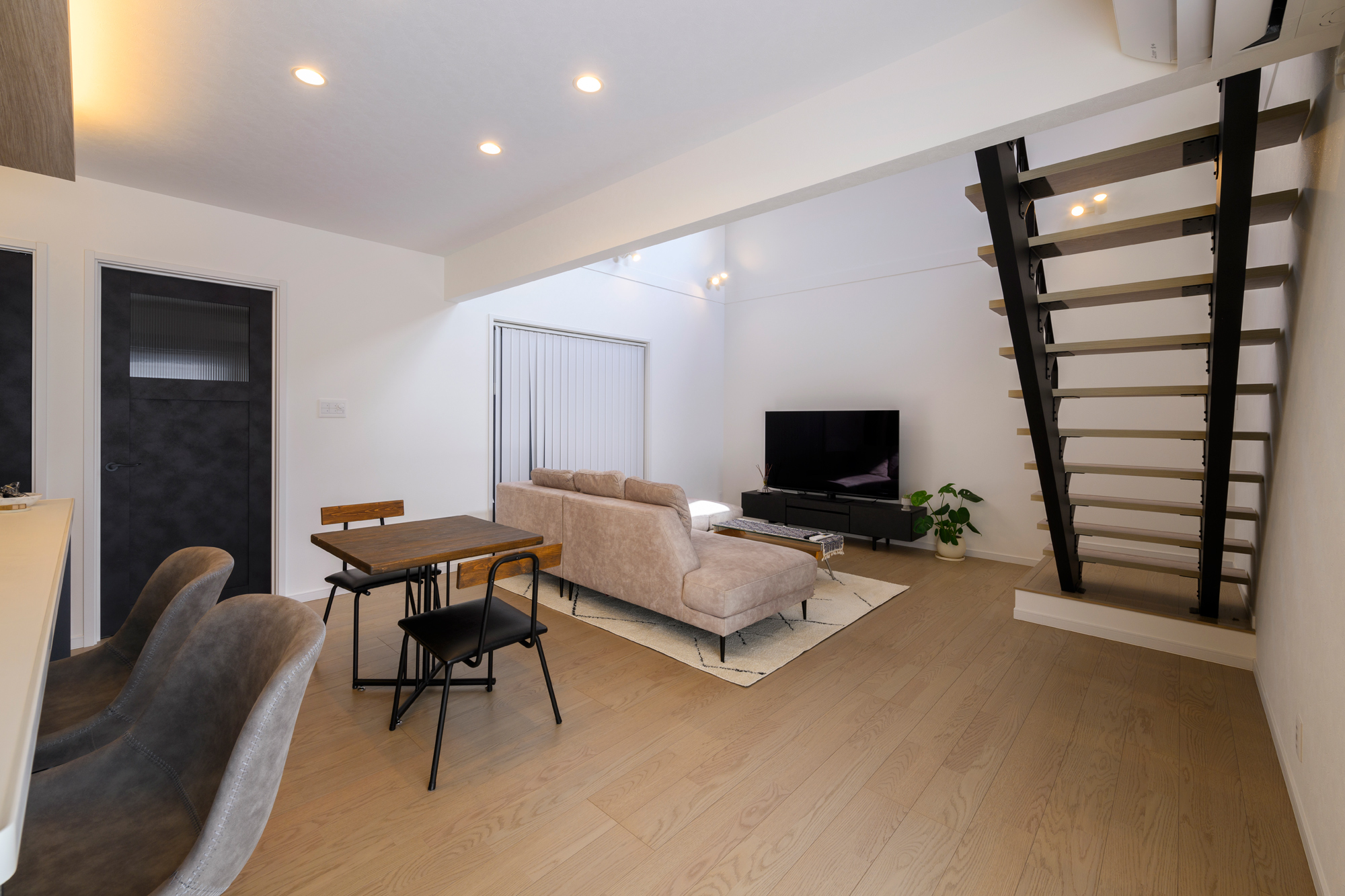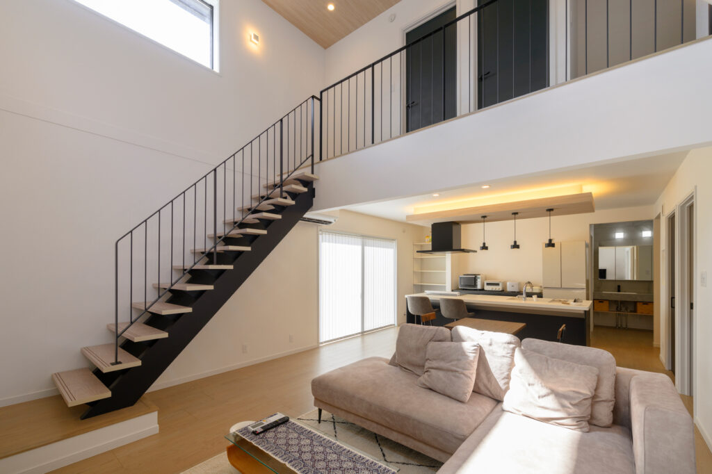 窓から明るい光の差しこむリビングにはスケルトンタイプの階段を選ばれたことで圧倒的な開放感が産まれました。