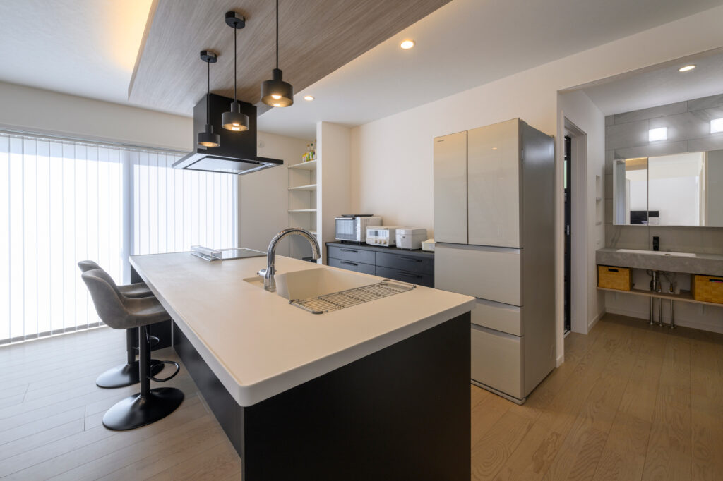 フルフラットのアイランドキッチンにカウンターの機能を持たせることで、軽い朝食などはそのまま取れるようになっています。