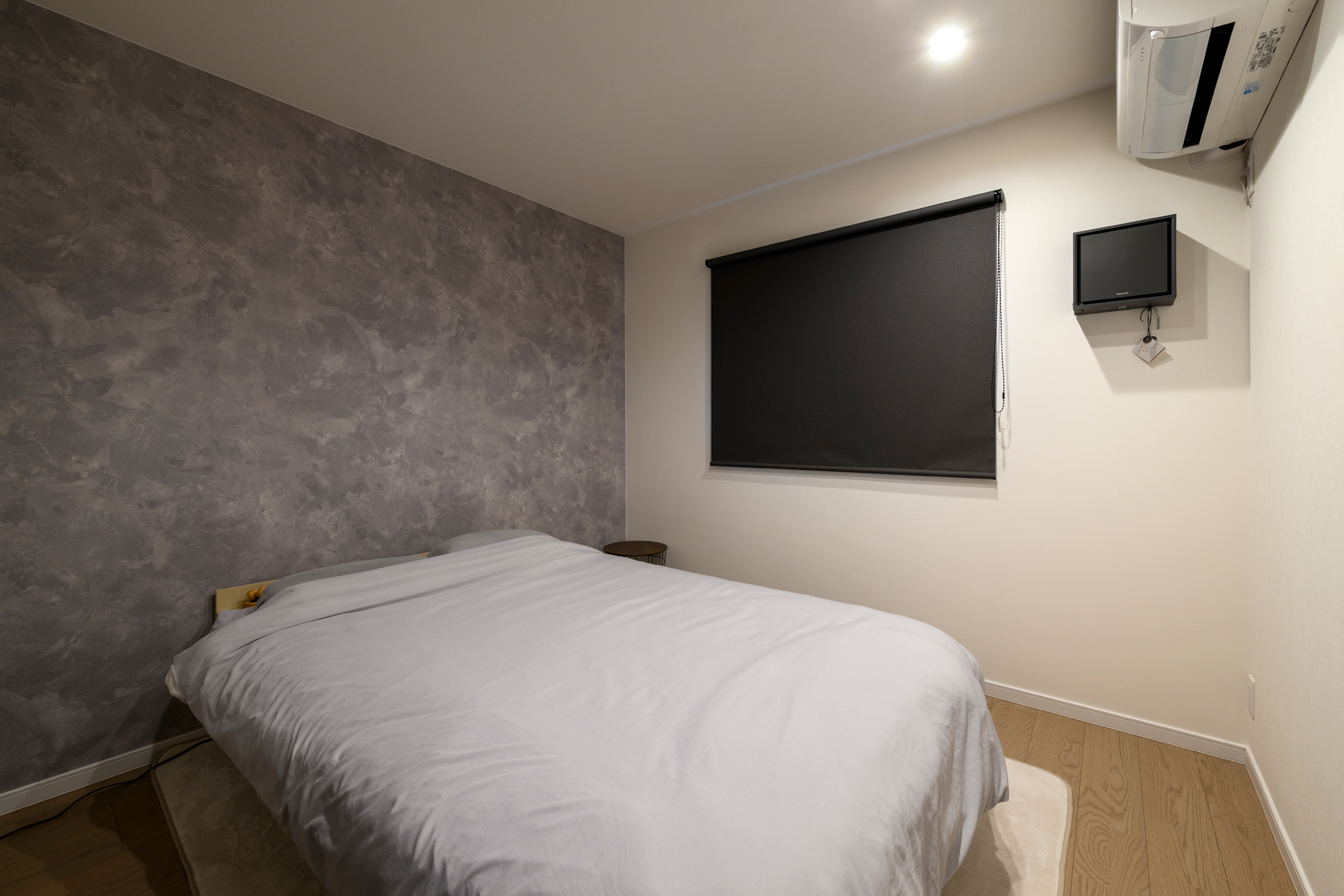 幅広タイプのオークのフローリングに白い塗り調の壁紙を合わせ、アイアンや石目調のグレーがインテリアのアクセント。