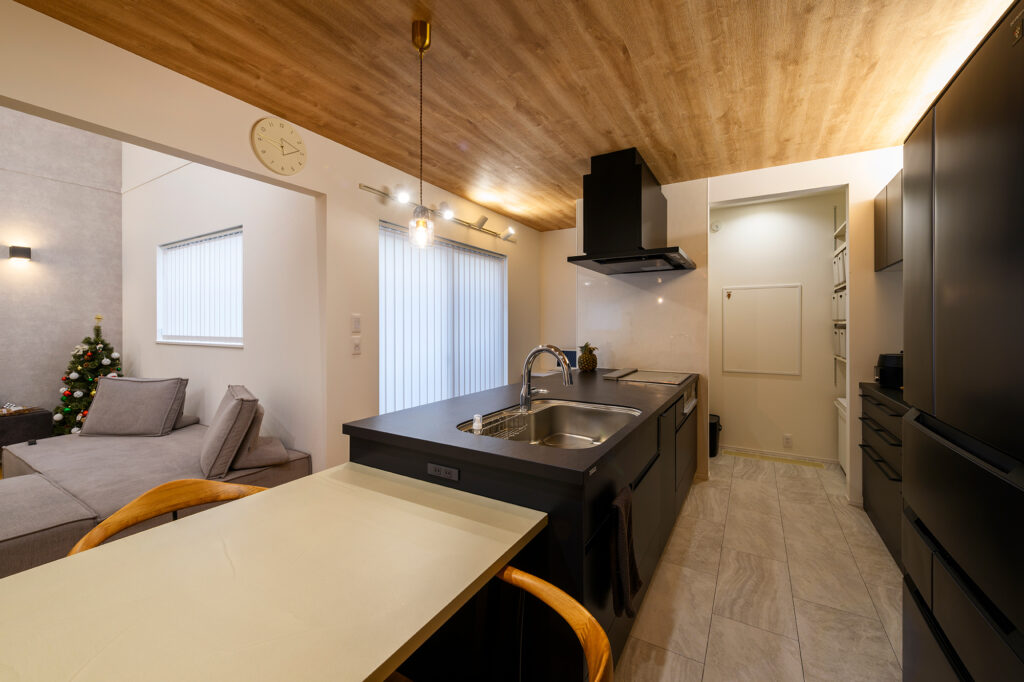 黒を基調としたフルフラットのキッチンに、同色の大容量の収納が設けられたダイニングキッチン。