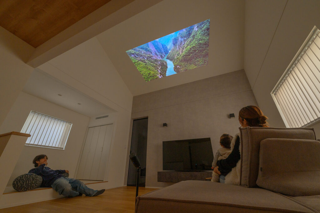 勾配天井のある広々リビングに、小上がりの畳コーナーや大きなソファを取り入れられたI様邸。