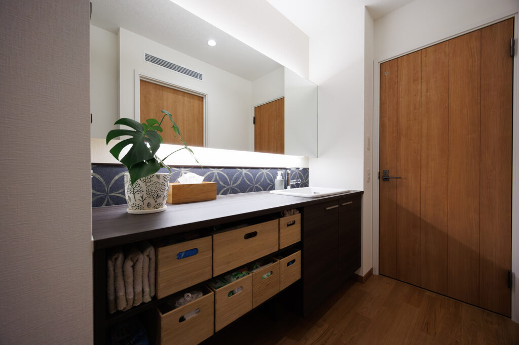 開放的な吹き抜けのあるピットリビング以外にも、広々とした土間スペース、大きな鏡のある洗面コーナー、キッチンをぐるりと回ることのできる動線など、見どころいっぱいなI様邸。