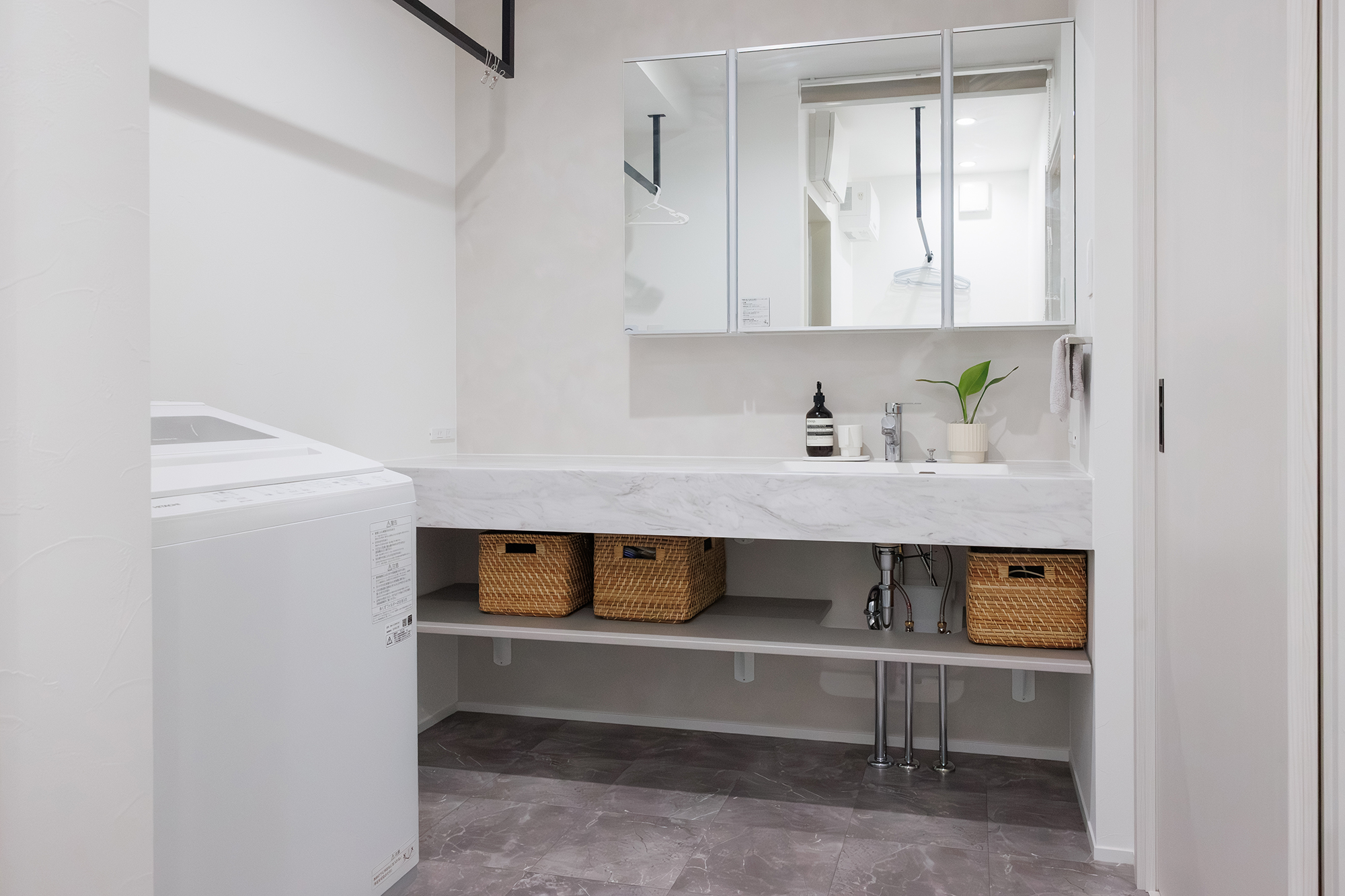 キッチンの周りをぐるりと回れ、水周りへもすぐにつながる間取りは毎日の家事も楽にしてくれますね。