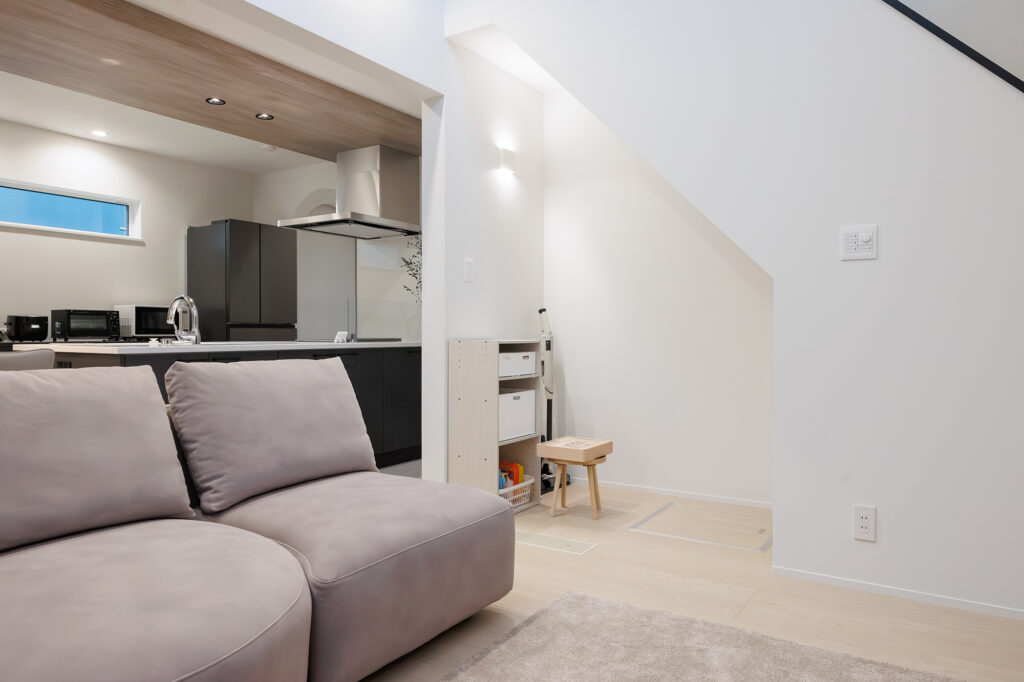 階段下にはキッズコーナーを設けたことで家事をしながらでもお子さまの見守りができ、お気に入りのおもちゃもすっきりと片付けることができます。