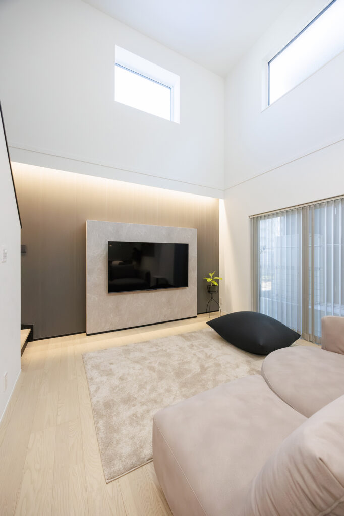 ぱっと目を引く壁掛けテレビは間接照明に照らされ、一層存在感のあるインテリアに。