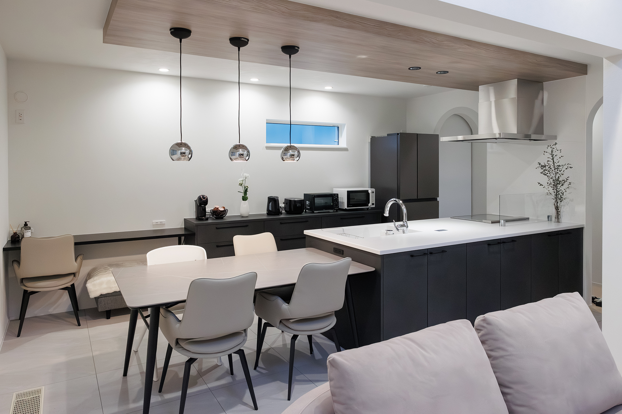 同じ黒い石目調の面材で揃えたバックカウンターと、黒い造作カウンターはまるで元々からのセットのようです。