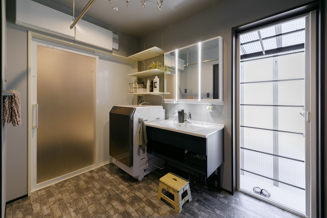 広々とした脱衣所にレンガ調の床を採用し、水回りもお洒落な空間に。