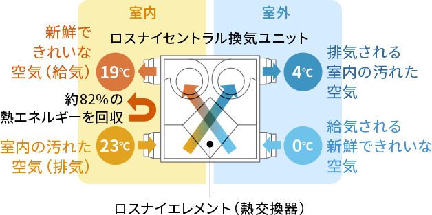 熱交換器により、換気の際に捨てられてしまう室内の暖かさや涼しさを再利用(熱回収)しながら換気します。約82%の熱エネルギーを回収でき、夏期・冬期の冷暖房負荷を低減し、省エネ換気が可能です。