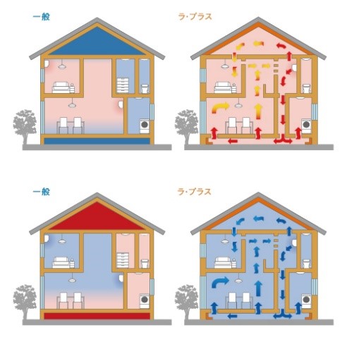 ラ・プラスのUa値は0.27※とZEH基準の0.6、HEAT20 G2の0.46をも上回る高い断熱性能を備えています。Ua値の優れた住まいは、ヒートショックや結露の防止など、適切な室内温度分布を実現している指標となります。
