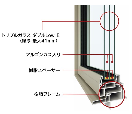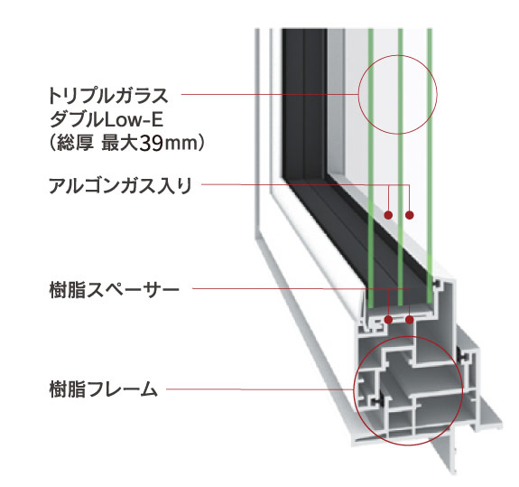 内外の2枚をLow-Eガラスで構成した3枚ガラス構造のサッシを採用。フレームもオール樹脂製にすることで、結露の抑制にも効果を発揮します。
