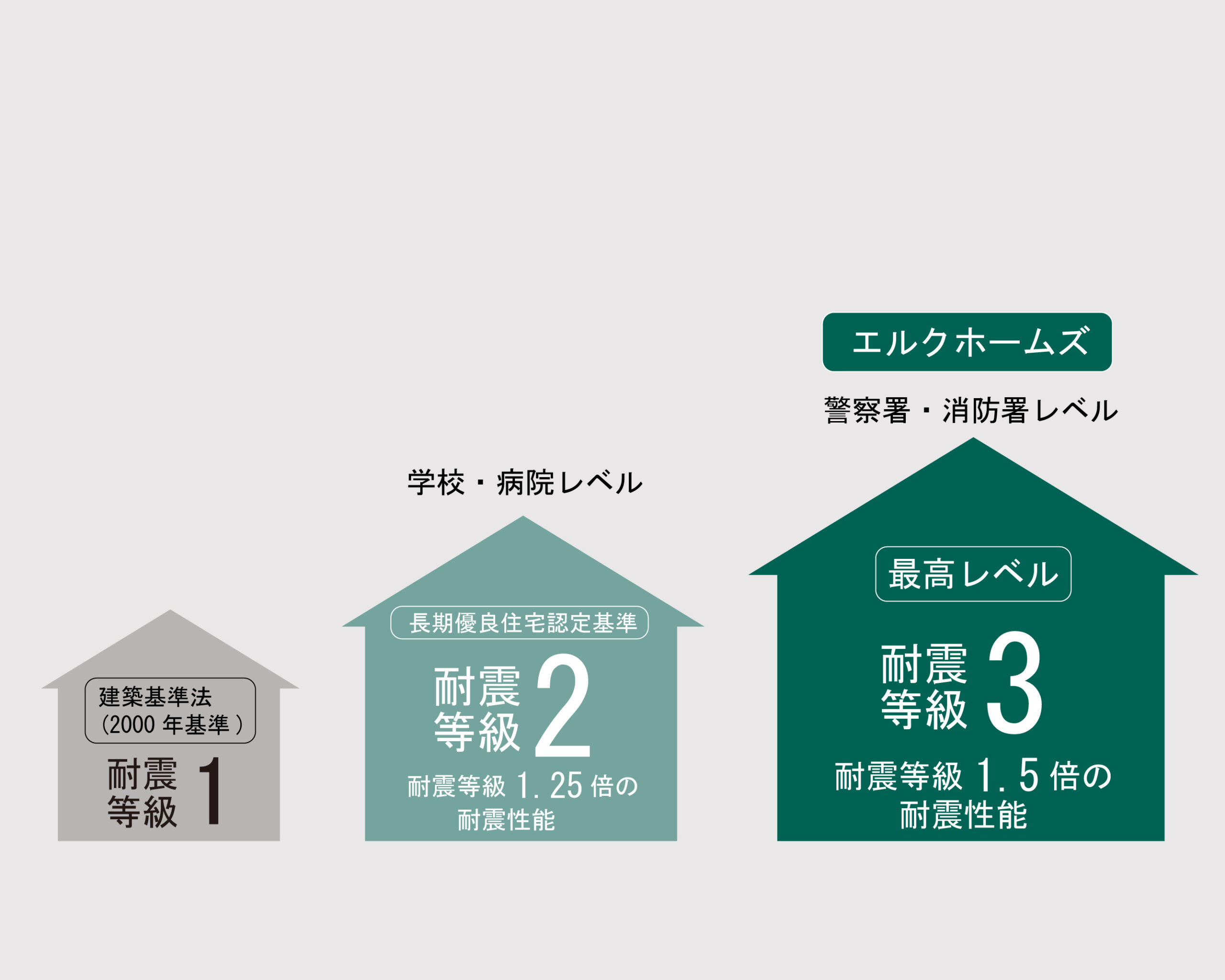 住まいの様々な品質を表示し客観的に判断できるよう国が定めた制度が「住宅性能表示制度」です。その耐震等級において、最高等級である「3」を全邸標準仕様として実現しています。