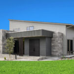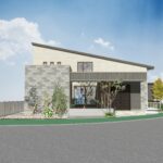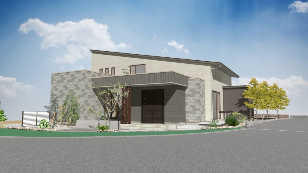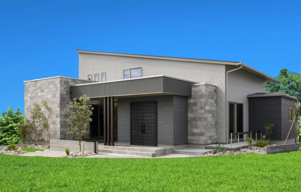 緩やかな勾配の大屋根と、グレートーンでまとめた外観にクールなエクステリアが印象的な住まい