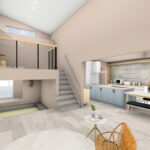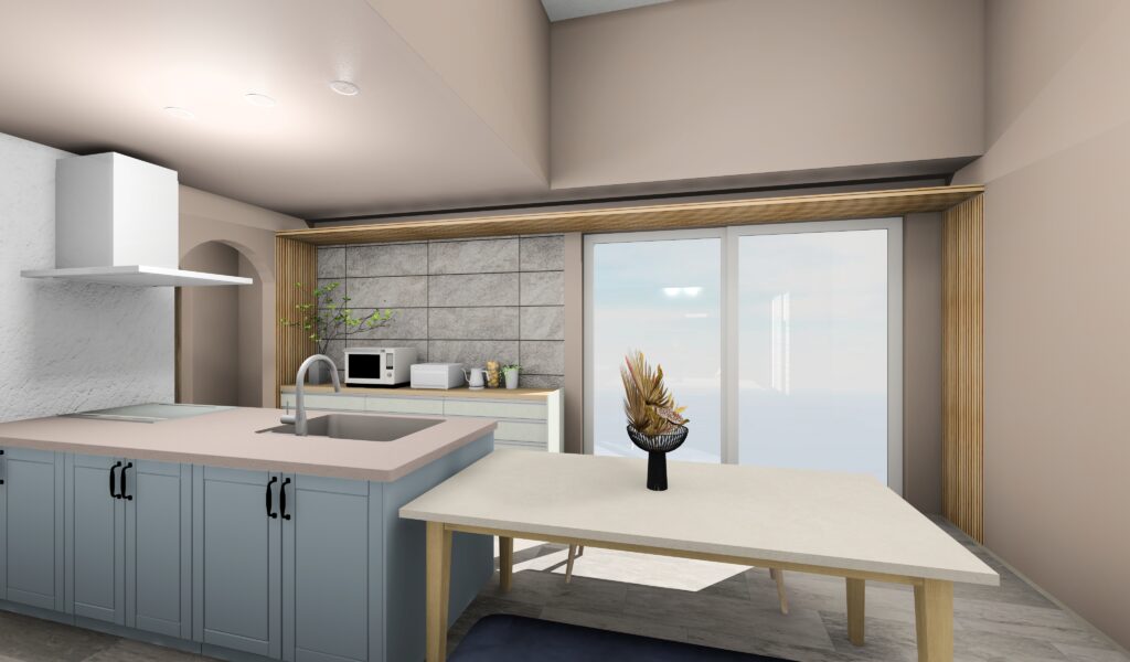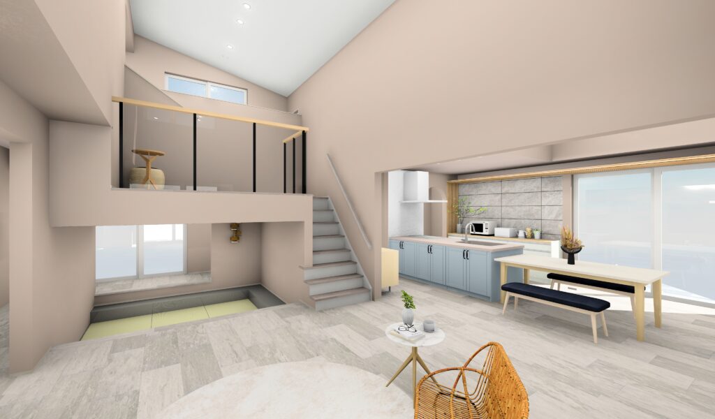勾配天井と吹き抜けのあるリビングに、木質感のあるリブパネルなどをインテリアに取り入れました。中二階・スキップフロアともつながる立体的な空間が遊び心のある間取りです。ダイニングキッチンには開放感と収納スペースとを両立できることから人気が高まっている高天井を取り入れることで、空間にアクセントを付けています。