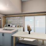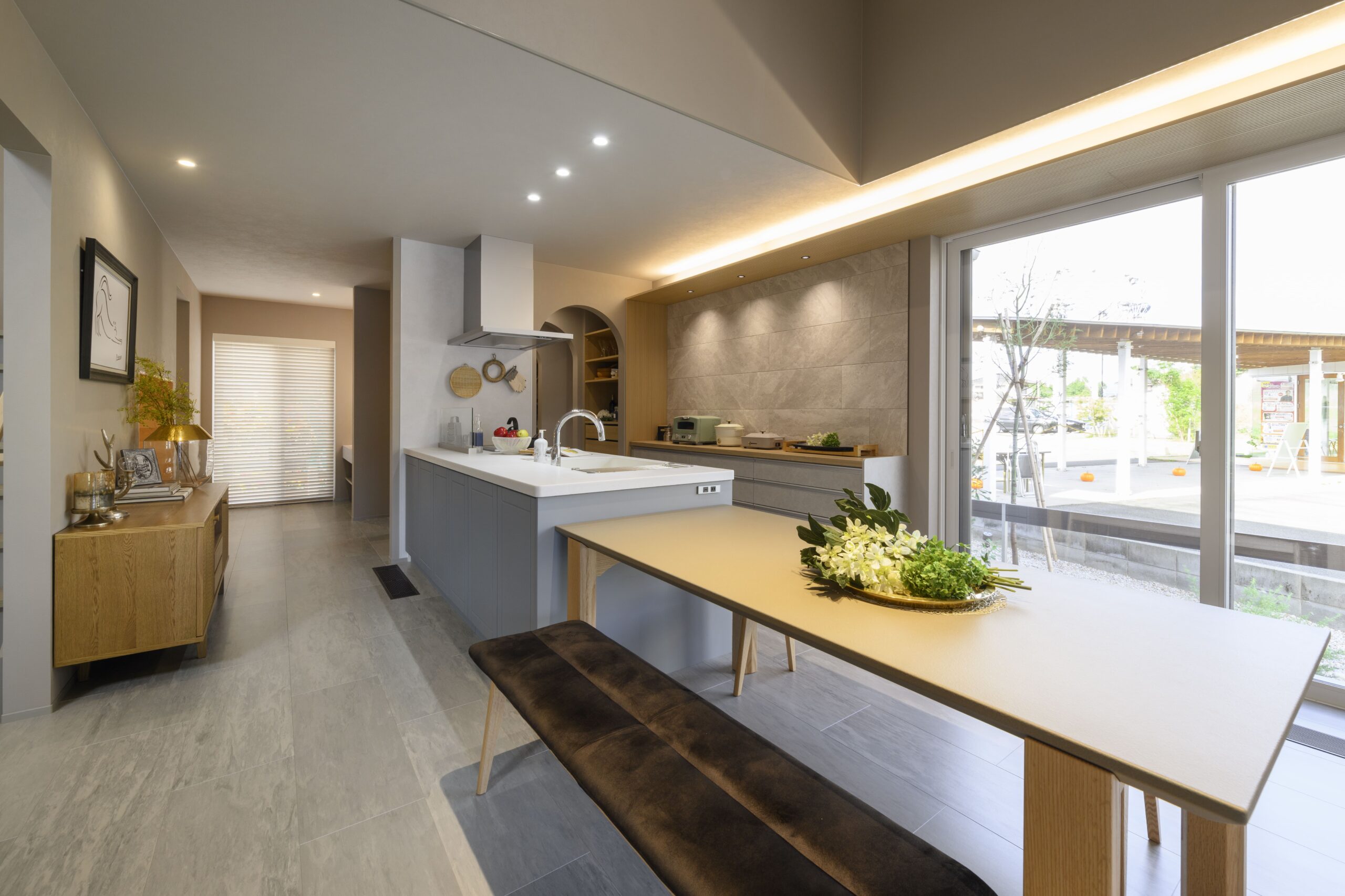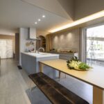 リビングとお揃いの木質リブパネルが印象的なダイニングキッチン。自然石の風合いを持つタイルと間接照明で高級感あふれるダイニングキッチンはまるでホテルでのひと時です。