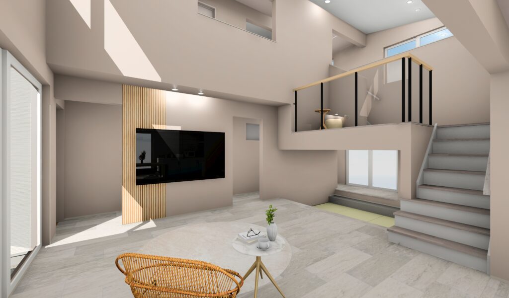 吹き抜けと高天井で立体的な空間演出をしたリビングダイニング