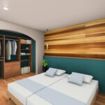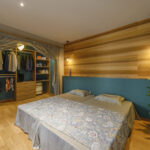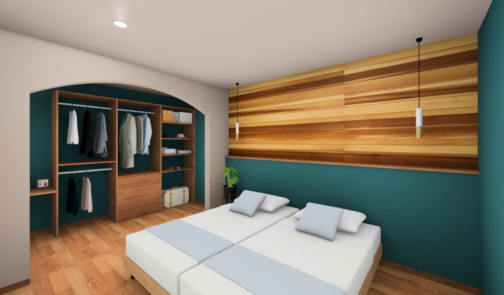 平屋の暮らしをイメージしやすいよう1階に配置した主寝室。1階に寝室があることで睡眠以外にも使えるようになり、寝る前に本を読んだり、趣味の時間に使ったりできる空間になります。LDKとは雰囲気を変え、レッドシダーと深いグリーンのクロスでカジュアルな印象に。収納もあえて見えるよう大きめの間口にアーチ垂れ壁を施した、寝室に入る度に気分の上がるようなデザインは必見です。