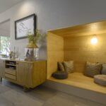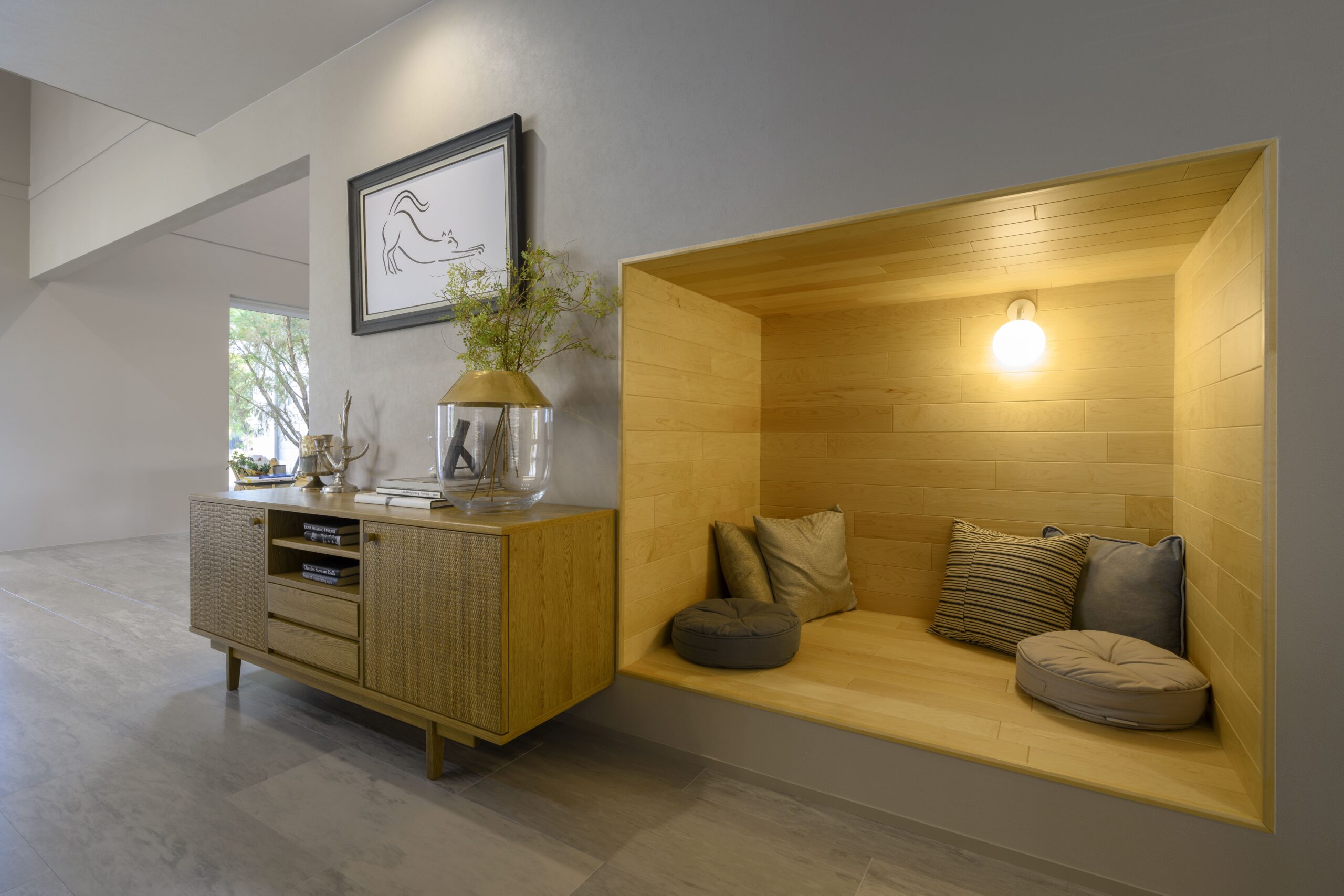 大開口のリビングに加え、和室に中二階、そして水回りへと続く廊下にはヌックスペースを配置。壁やドアといった仕切りをできるだけ設けず曖昧につながりつつも、それぞれの空間に没頭できるような配置にして、家族の気配を感じながらそれぞれの時間を過ごすことができます。