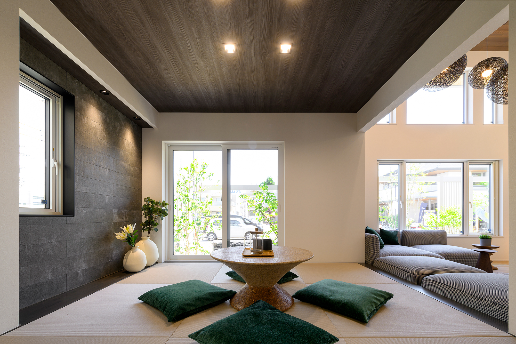 開放的な吹き抜けにレッドシダーの勾配天井が美しいリビング。