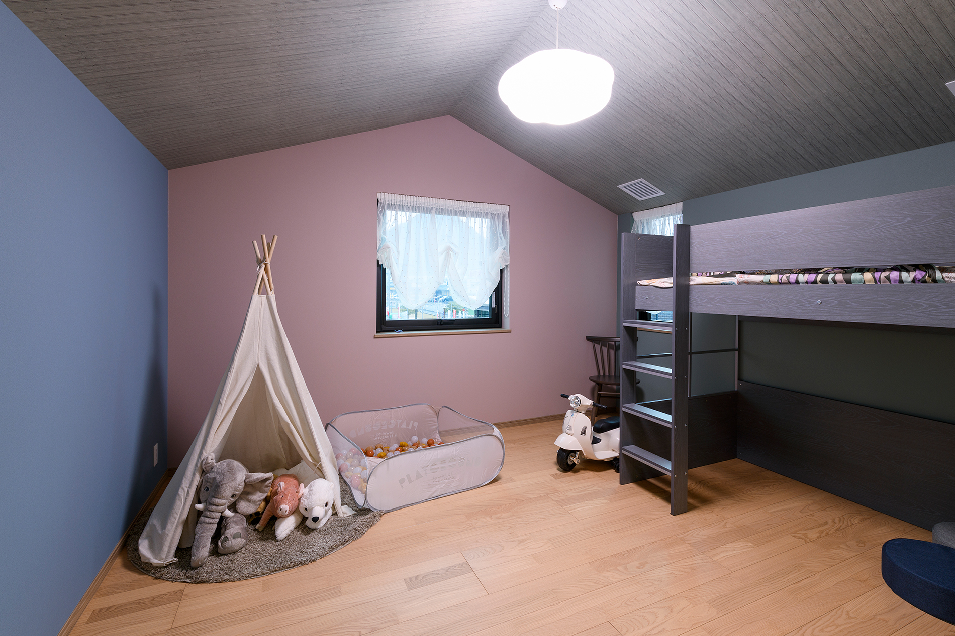 優しい色合いの壁紙で貼り分けられた子供部屋。
