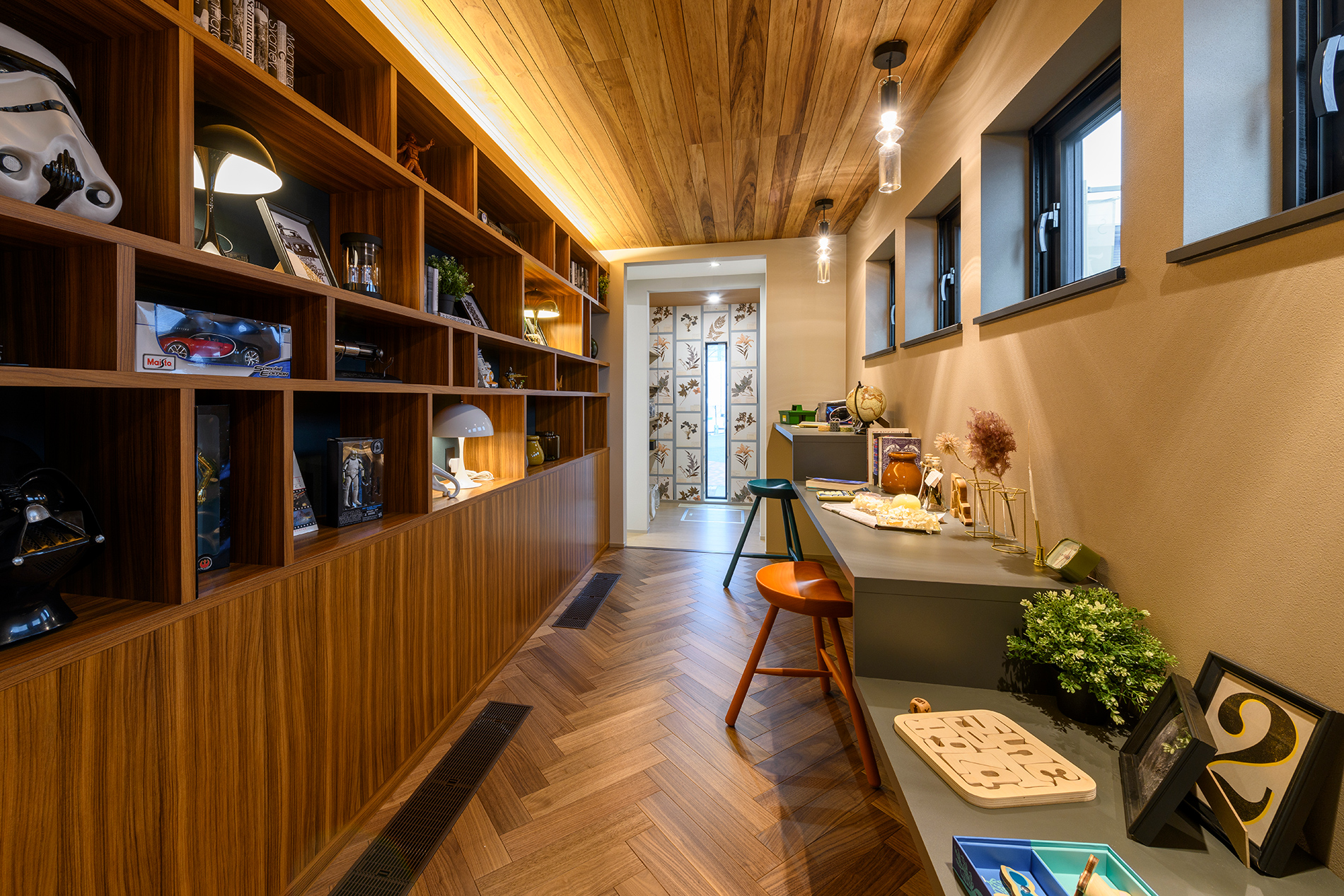 まるで秘密基地のような雰囲気の書斎スペースには、家族がそれぞれの趣味を楽しめるような工夫が満載です。