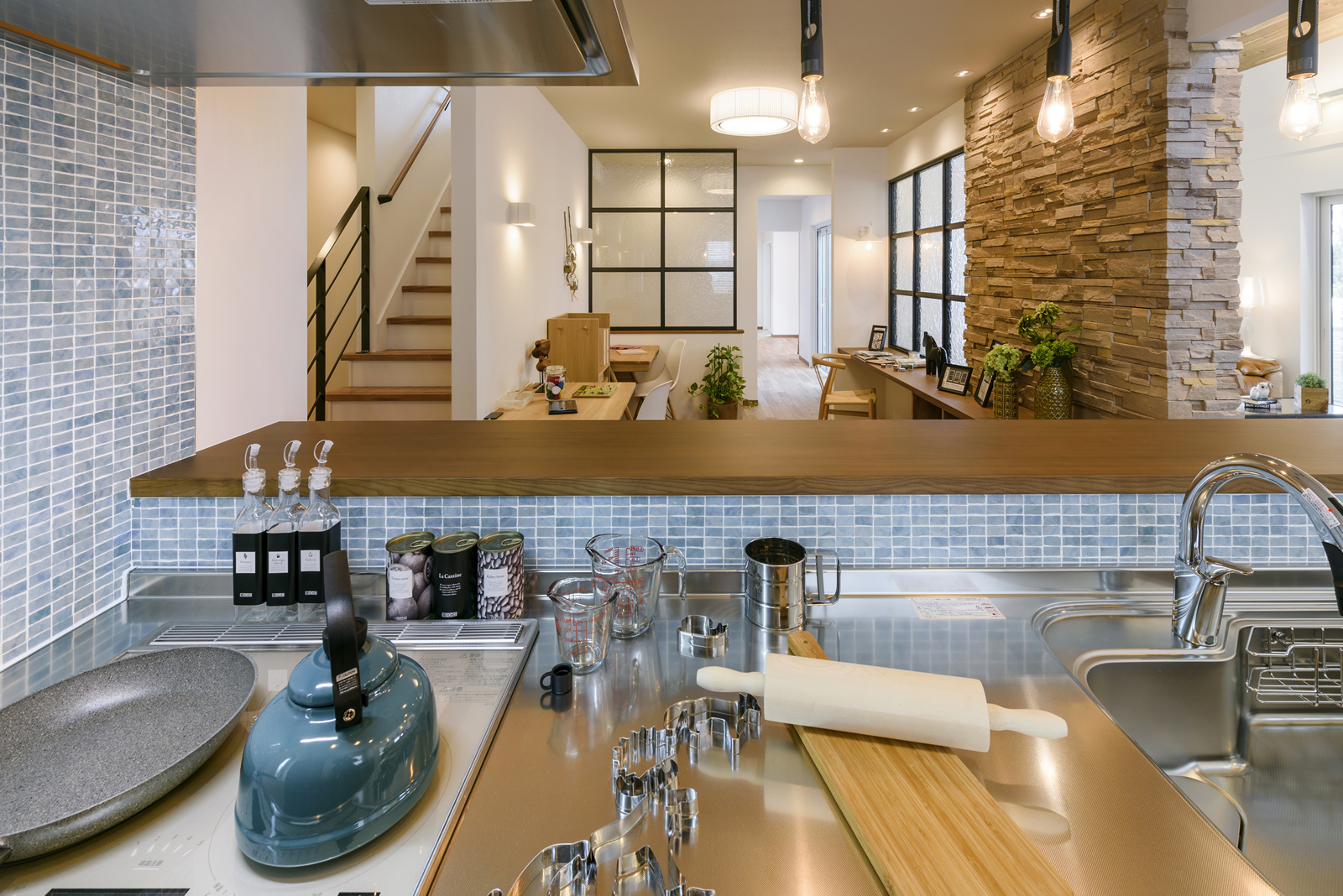 奥様がキッチンで料理をしながら、ご主人様、お子様が会話しながら料理を待つ、幸せな空間が想像できます。